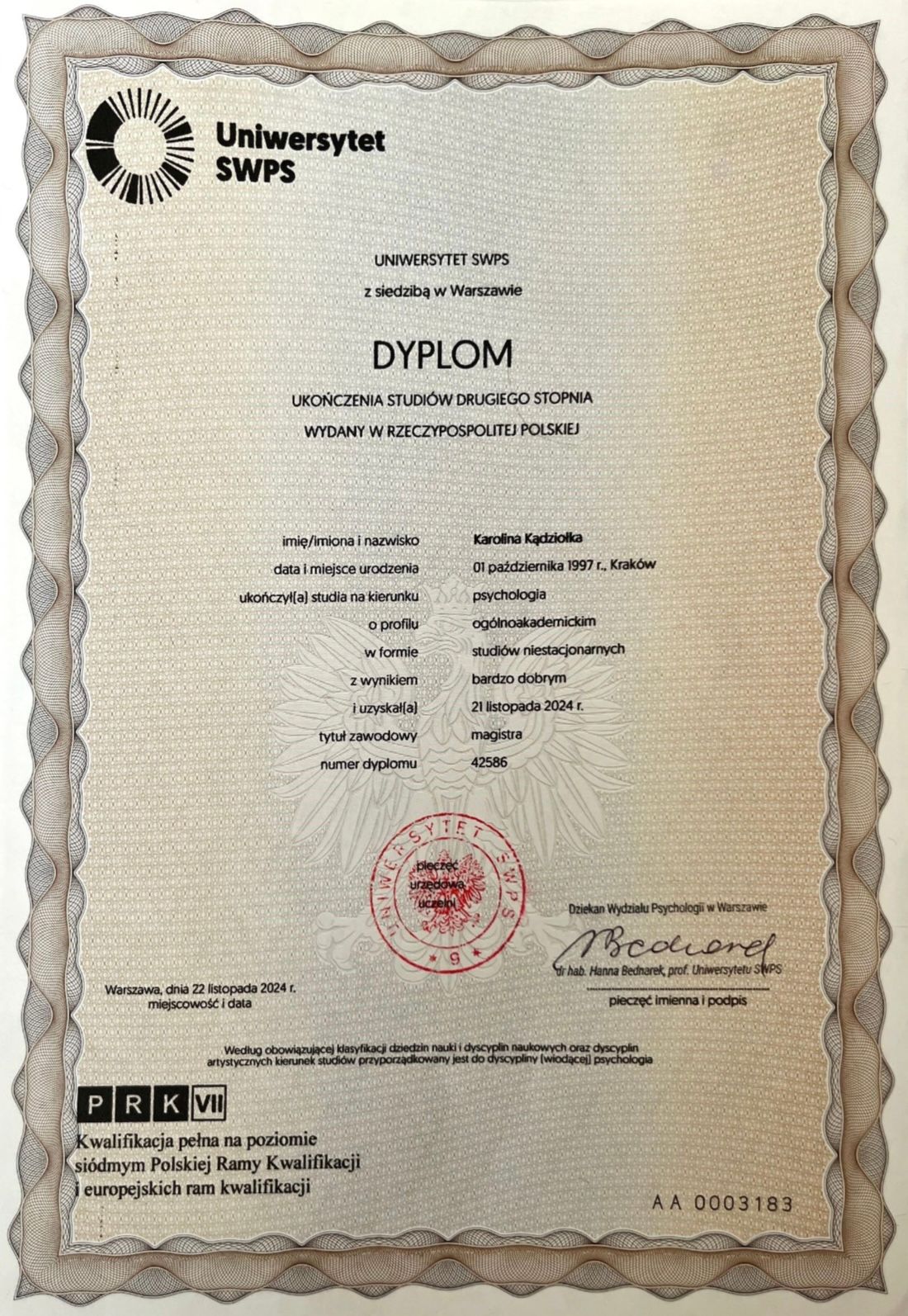 Nazywam się Karolina Kądziołka i pracuję z osobami dorosłymi, które chcą lepiej rozumieć siebie i swoje relacje. Towarzyszę tym, którzy czują, że utknęli, są zmęczeni emocjonalnie lub mają wrażenie, że ich potrzeby przez długi czas pozostawały w cieniu.